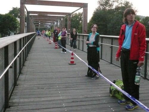 Durch ein Wasserschutztor und über einen schmalen Pflasterweg erreichen wir die Jugendherberge. Gleich daneben liegt das Universitätsstadion, wo wir später ins Ziel laufen. Wir biegen jetzt aber auf den Hirsefeldsteg ab. Kurz danach kommt die 1. Wechselstation für die Marathonstaffeln, an der sich eine große Menschenmenge versammelt.