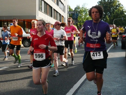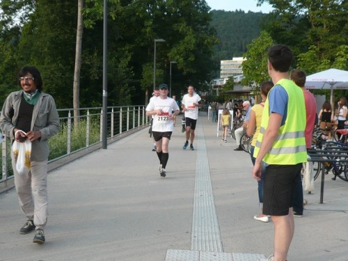 Im Bereich der Kleingärten gibt es wieder eine Versorgungsstation, die reichlich genutzt wird, denn es ist noch richtig heiß in der Sonne. Weiter geht es dem Fluss entlang Richtung Stadt. Hier am Lahnufer wird kräftig gefeiert. Die (meist jungen) Leute applaudieren den (meist älteren) Läuferinnen und Läufern.