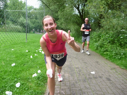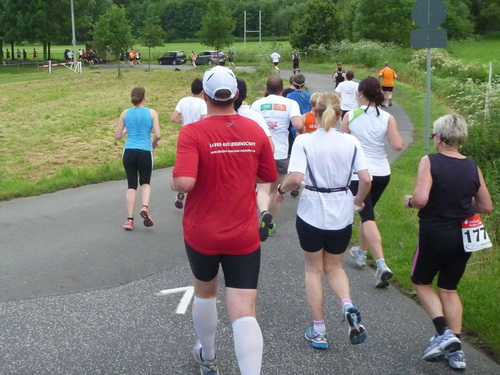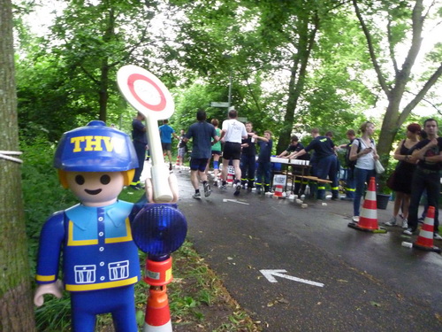 Kurz vor dem Halbmarathonziel wieder Sanitäter, die haben heute alles im Griff. Réné registreirt freundlich, dass ich Wasser nur für meine Birne nutze und düst weiter Richtung Ziel.