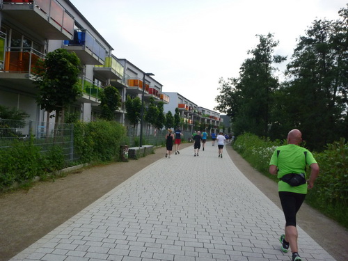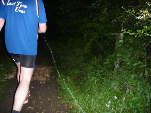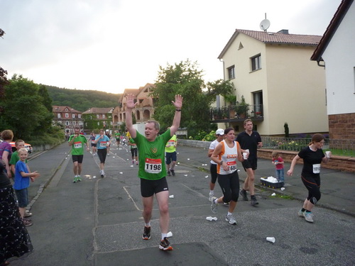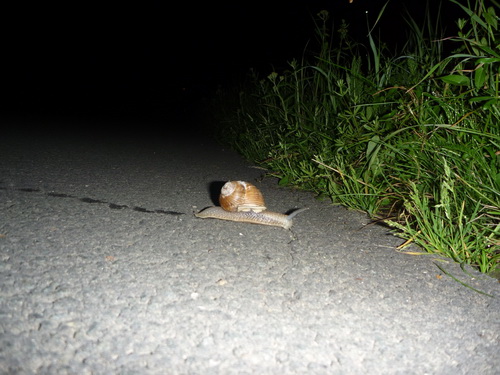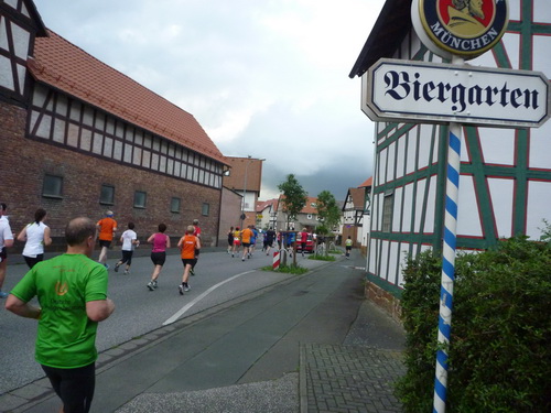 Wieder Richtung Gissselberg muss ich herzhaft lachen. Die Schnecke mit ihrem feuchten Weg, mir läuft die Brühe ja auch, aber sie ist schneller. Jetzt hat der Joe einen an der Klatsche! Und die lässt er dort, zunächst an der netten Verpflegungsstation bei eiskaltem Bier, bis Klaus Jahnz und Markus Sembach ihn dort aufwecken, um dann 5 Meter weiter bei der Blutbank den Druck nochmals zu erhöhen. Ach wie schön ist Manama, Marburg-Nacht-Marathon!