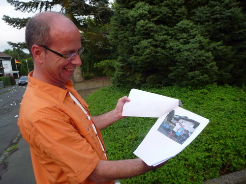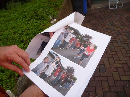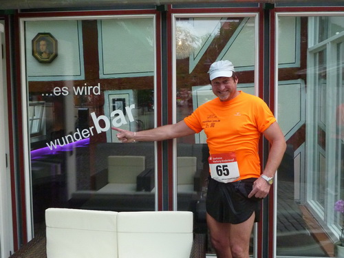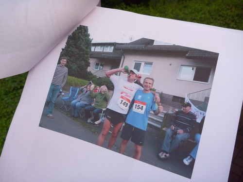 Seit Ewigkeiten ist die Hausnummer 4, die Zentrale der Fangemeinschaft Blutbank in Gisselberg, das herzliche Herzstück des Nachtmarathons. Ein dicker Bildband fängt mit Bildern von unserem Klaus D. aus dem Jahre 2007 an und endet mit den Fotos von letztem Jahr, als ich mit dem Berliner Andenkenverkäufer Thomas hier einen Zwischenstopp einlegte. Ein Großfoto von Wolfgang, dem heimlichen Zuschauer heute, er wird stark vermisst, hat wohl hier tiefen Eindruck hinterlassen.