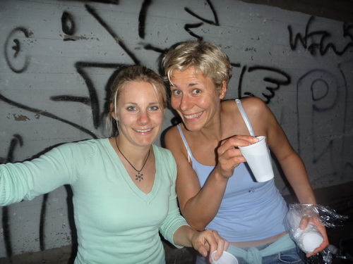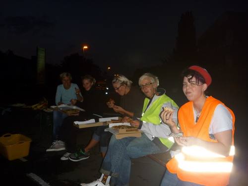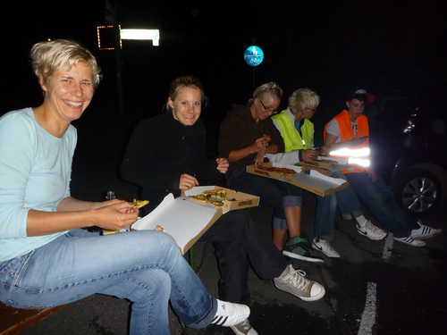 Km 29 unter der Brücke. Die gutaussehenden Mädels von der Verpflegungsstation futtern dicke Pizzen. Dabei gibt es jede Menge Schokokekse, Bananen und Powergels, Cola, Iso und Wasser! Ja, der Marburg Nachtmarathon hat optimalen Service, und das Auge isst ja bekanntlich mit. Aber ich quetsche mir auch mal ein angebotenes Gel rein. Sogar das schmeckt hier erstaunlicherweise wunderbar.