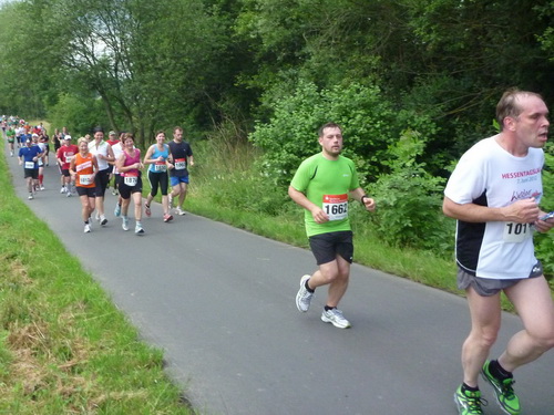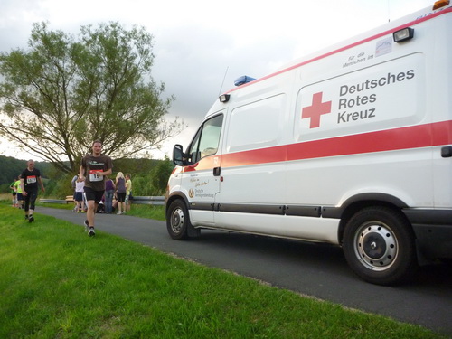 In Gisselberg auf dem Damm liegt Jasmin. Robert ist schon bei ihr. Da es mir auch nicht gut ist, geselle ich mich dazu, halte ihre Beine fest, damit die nicht von den Leitplanken rutschen. Habe gelernt, dass auch wenn man selbst nicht sehr aktiv ist, es den Helfern hilft, wenn sie nicht alleine sind. Und Robert macht das gut, weckt Jasmin immer wieder auf. Läufer holen Hilfe, Kinder Wasser. Nein, es ist nicht ihr erster Halbmarathon. „Aber ich war doch so gut in der Zeit!“ Und dann droht sie wieder wegzudämmern. Immer wieder klatsch, klatsch auf ihre Wangen. „Bleib hier!“ „Rede mit mir, schau mich an!“ Robert ist Spitze. Es dauert eine gefühlte Ewigkeit, bis sich zwei Läufer mit Saniausbildung dazugesellen, dann kommt aber auch schon der Notarzt.