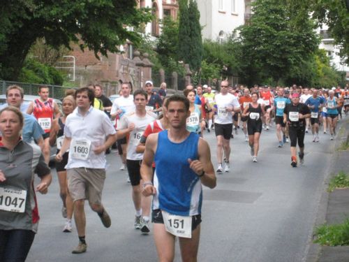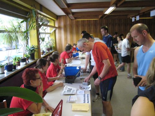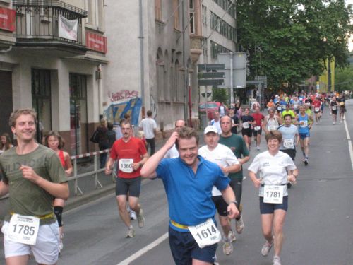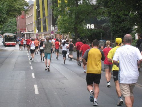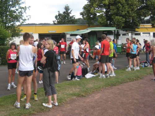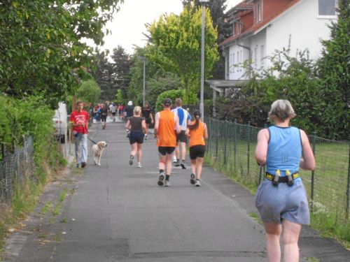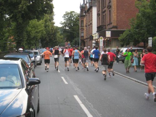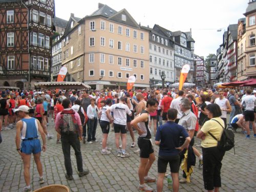 Die Anreise war vom Süden her am Freitagnachmittags nicht ganz unproblematisch. Ich vermied die Rheintalautobahn über Heidelberg, Mannheim, Darmstadt, Frankfurt, sondern fuhr über Würzburg, Aschaffenburg, also weiträumig an Frankfurt vorbei und hatte tatsächlich keinerlei Stau. Lediglich die Parkplatzsuche um das Universitätsstadion herum dauerte länger. Trotzdem konnten wir die Startnummern rechtzeitig abholen und uns auf den etwa 10 Minuten langen Fußmarsch zum Start machen.