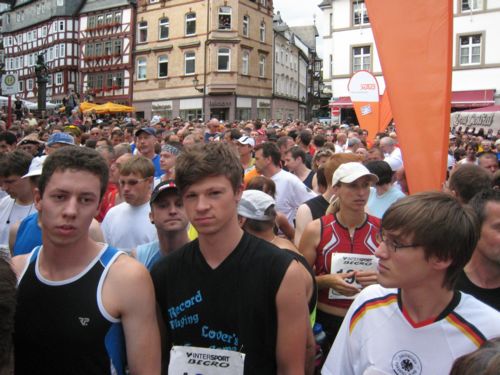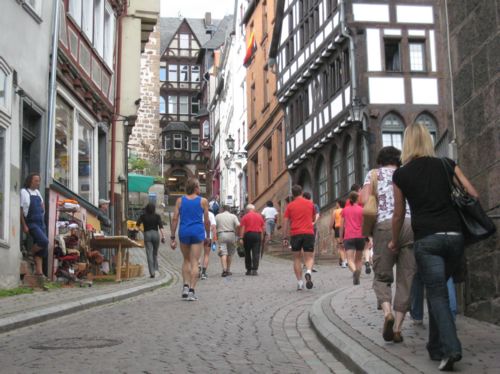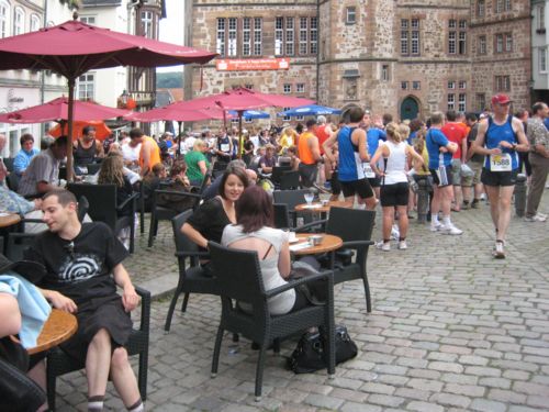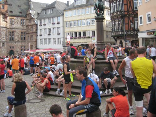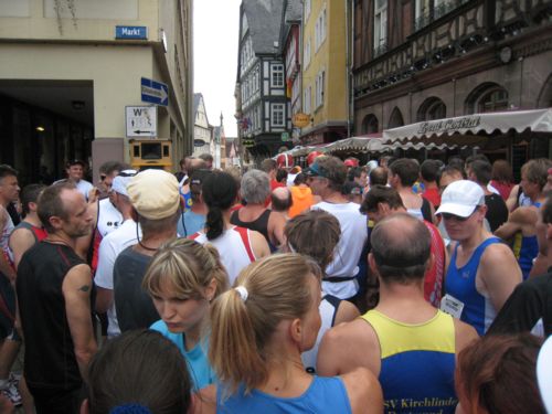Auf dem Marktplatz tummelten sich etwa Tausend Läuferinnen und Läufer, denn im Gegensatz zum Vorjahr starteten auch die Halbmarathonis gemeinsam mit uns. Sicher hat dieser Marktplatz in seiner langen Geschichte schon viele Feste erlebt, aber auch für einen solch modernen Anlass ist der historische Platz die passende Kulisse. Knapp 500 Jahre ist das Rathaus alt und die vielen schön restaurierten Fachwerkhäuser um den Marktplatz herum zeigen, dass Marburg eine alte Stadt ist. Dass die Stadt auch eine Universität beherbergt, sah man an den vielen jungen Läuferinnen und Läufern, die hier am Start standen und vornehmlich den Halbmarathon laufen wollten.