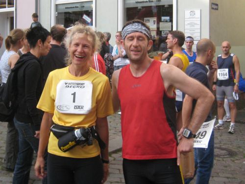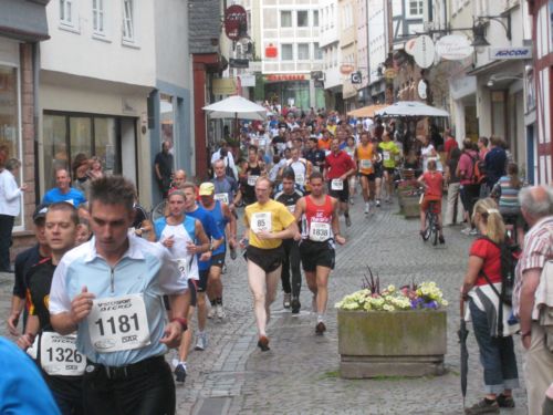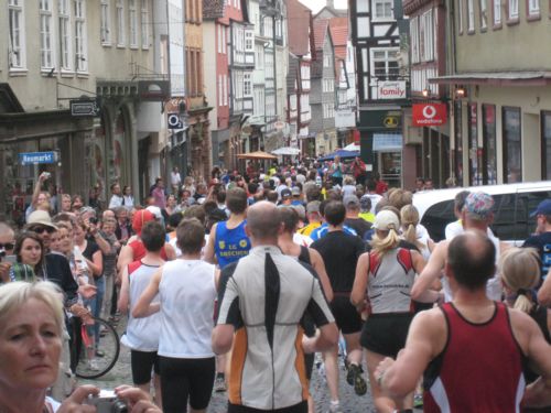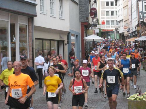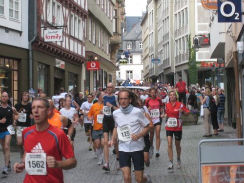 Um 19 Uhr fiel der Startschuss und los ging es mit Karacho die Gasse abwärts. Der Marktplatz liegt oben in der Stadt und der erste Kilometer führt durch die Barfüßergasse angenehm abwärts, so dass man flott loslaufen konnte, sofern man vorne stand. Alle anderen mussten bis zu drei Minuten warten, bis sie vom großräumigen Marktplatz, durch die „Zeitmessohren“ in die enge Gasse kamen, so dass es hier ganz ordentlich staute.