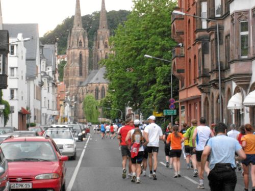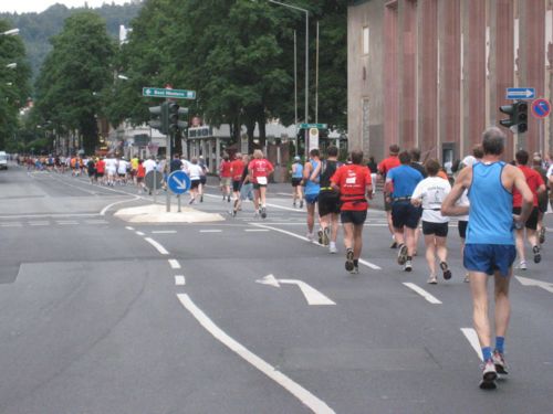Endlos zog sich die Läuferschlange die Gasse hinunter, wurde dann nach etwa einem Kilometer in einer engen 170 Grad-Kurve nach links in die halbseitig gesperrte Universitätsstraße geführt und ab hier ging es dann eben weiter durch die Stadt. Bei etwa Kilometer drei lief man auf die Elisabeth-Kirche zu, die man dann aber großräumig umlief und die Stadt Richtung Norden verließ. Hier kam ich mit drei Läufern ins Gespräch, die heute ihren ersten Marathon liefen. Als Zielzeit hatten sie sich 4:30h vorgenommen und lagen hier ganz gut in der Zeit. Sie bekamen noch ein paar ungebetene Tipps und hatten sich bald nach vorne abgesetzt.