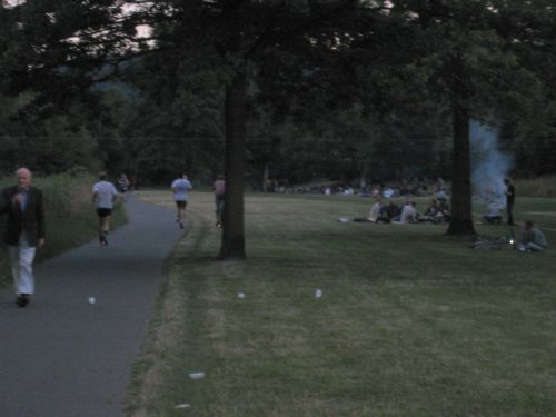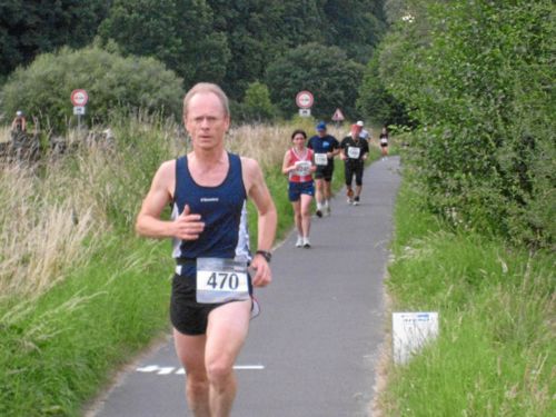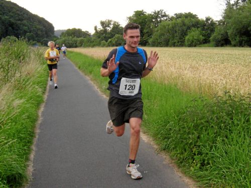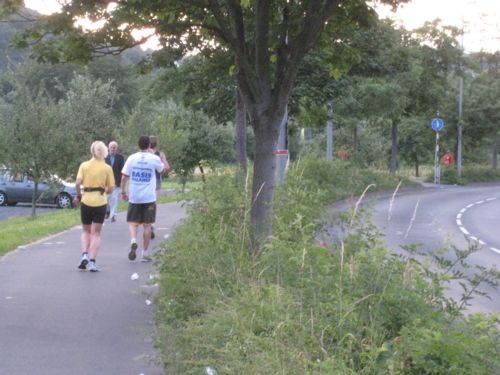 Wieder passierten wir die Wiese, die noch immer Tummelfeld der Müßiggänger war, die uns nicht beachteten. Die Strecke selbst war ohne die Halbmarathonis recht leer geworden, nur die Marathonläufer, die uns auf ihrer letzten Runde immer wieder überholten, brachten noch ein wenig Leben auf die Strecke. Läufer, die wir hätten überholen können, gab es keine. Halt, doch, einige hundert Meter vor uns sahen wir Dietrich, der immer wieder eine Gehpause einlegte, um dann wieder zu joggen. Nur ganz langsam kamen wir ihm näher und erst gegen Ende der zweiten Runde hatten wir ihn einge- und überholt. Tja, an so was erfreut man sich, wenn es nicht mehr so gut läuft.