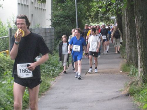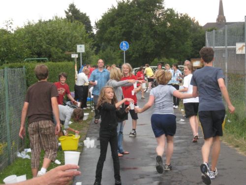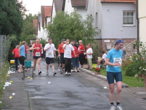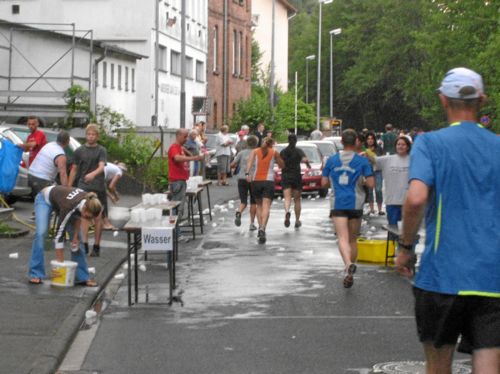Ein paar hundert Meter ging es einer Wiese entlang, auf der sich jede Menge junger Leute der Faulheit hingaben, im Gras lagen, Fußball spielten oder grillten und uns nicht beachteten. Weiter vorne dann kam von rechts die B255 und die nächsten knapp 3,5 Kilometer lief man auf einem Radweg, rechts die Straße, links hinter Büschen versteckt der Fluss. Kurz vor Kilometer 15, also nach vier Kilometern der Runde, erreichte man Gisselberg. Der Weg führte links weg in eine Wohnstraße, an deren Ende die nächste Verpflegungsstelle lag, ebenfalls bestens ausgestattet.