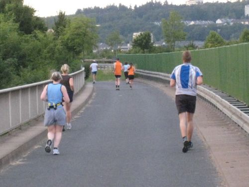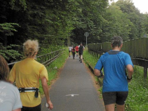 Etwa bei Kilometer fünf hatten wir den Stadtteil Wehrda erreicht, liefen dann auf einer Brücke über die Lahn und auf der anderen Flussseite wieder nach Süden, zurück nach Marburg. Hier im Lahntal lief man auf asphaltierten Wegen durch Wiesen, abseits von jeglichem Verkehr.