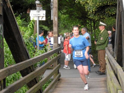 Die restlichen drei Kilometer liefen wie geschmiert, wenn man das bei einem Schnitt von 6:40 min/km sagen kann. Ein kurzes Stück ging es der Straße entlang, wieder links weg zum Fluss, vorbei am Campingplatz, dann kam rechts das Freibad und kurz danach war das Stadion erreicht, wo die Halbmarathonis noch eine halbe Stadionrunde bis ins Ziel hatten. Wir aber wurden nach links weg über die bekannte Holzbrücke auf unsere nächste Runde geleitet.