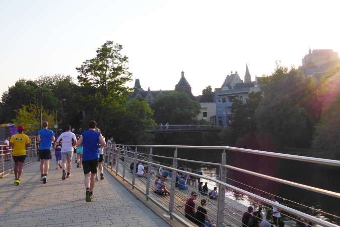 Die Hauptarbeit hatte Eugen Leipner, der Chef. Ihn treffe ich nachher im Ziel. Zunächst verabschiede ich die Halbmarathonläufer in Richtung Stadion und begebe mich auf die nächsten zwei Runden, die am Hirsefeldsteig anfangen. Der wurde 1913 mit Privatinitiantive erbaut, ehe sich 2010 die Stadt zur Finanzierung der Erneuerung entschloß. Die 28 Meter der freitragenden Brücke sind eine Herausforderung, denn ich habe mich 2012 fürchterlich hingelegt, weil die Bretter zwar rutschfest, aber uneben sind. Was soll´s. Zuvor auf dem alten, erneuerungsbedürftigen Steg hatte es mich auch gerissen.