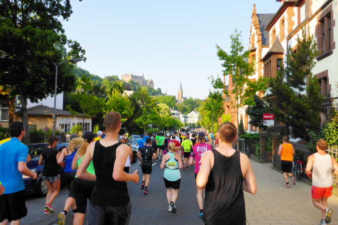 Als 1967 das Marburgfieber zum ersten Mal die Laborangestellten in Marburg traf, wurde die Stadt in einen Ausnahmezustand versetzt. Heute setzt der Nachtmarathon zum 18ten Mal die Unistadt in Ausnahme. Fast zweitausend Studenten treten beim Halbmarathon an, wühlen, schwitzen und hoffen auf Unterstützung von ihren grillenden Kommilitoten, sorry –tonen auf den Lahnwiesen. Anmelderekord. Heute brennen die Wiesen, und wenn die Halbmarathonis nach dem Zieleinlauf im Unistadion liegen, dann laufen knapp 100 Marathonläufer und über zweihundert Staffelläufer noch zweimal die südliche Streckenhälfte durch die Dunkelheit.