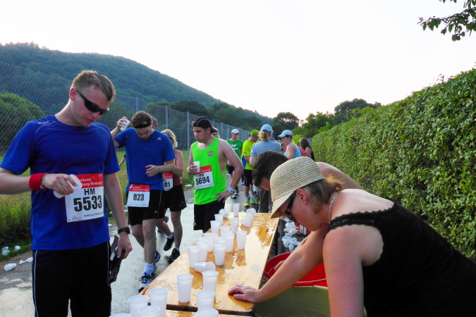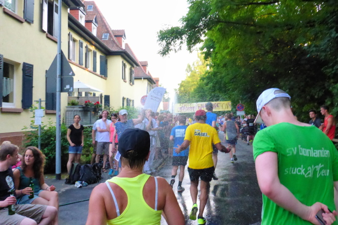 Beim Hirsefeldsteig geht es auf die andere Lahnseite zum nächsten Staffelwechselpunkt. Jede Menge Trubel und jede Menge kühles Nass aus dicken Schläuchen werden aufgeboten. Die nächsten Kilometerchen gehen ruhig am Ufer entlang, bis wir zur großen Wiese kommen. Da sind das Bier und die kühnen Grillkonstruktionen noch kalt, die Studenten aber sehr fiebrig, grüßen mich, als sei ich Boris Becker. Ich werde noch zweimal hier vorbeilaufen. Dann aber wird das Bier warm und die Steaks auf dem Lidlwagen heiss sein. Dann muss ich starkt aufpassen, denn Bierentsorgungswillige kreuzen häufig die Laufstrecke, weswegen sich eine Stirnlampe empfiehlt. Nicht zum Spannen, man sollte den Scheinwerfer bei Wildwechsel schliesslich ausschalten. Es ist meine Lieblingsstrecke hier. Wenn ich bald Student bin, dann werde ich auch hier den ganzen Tag auf der Wiese rumgammeln, grillen, Bier trinken und den verrückten Läufern hinterherschauen.
