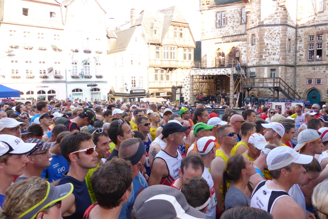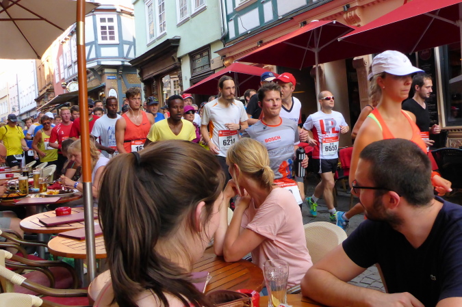 Zunächst stellt der Moderator Arthur Schmidt dem Oberbürgermeister einige Fragen, dann wendet er sich an mich, erwähnt meinen Namen. Ob Egon Vaupel wegen meines Namens oder meiner 283 Marathons zusammenzuckt, ich weiss es nicht. Wegen eines schweren Herzinfaktes 2013 gibt er den Posten als Oberbürgermeister auf. Es ist heute sein letzter Schuß. Unser beider Wege trennen sich endlich. Auf einer Bistrobank stehend fotografiere ich den Start und reihe mich ein, als die Läufer langsamer werden.