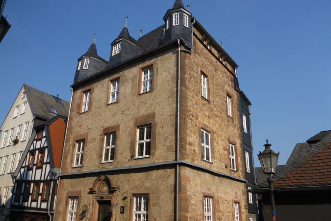Rechts vom Eckhaus Markt 11 mit seinem Fachwerktürmchen ist die Nikolaistrasse, benannt nach der alten Marburger Familie Nicol. Bei der Adresse Nikolaistrasse 3 steht das Hochzeitshaus, welches dieses Jahr auf der Finishermedaille zu sehen sein soll. In dem Haus mit dem schiefergedeckten Walmdach und den 6 Ecktürmen wurde nie eine Hochzeit geschlossen oder gefeiert, der Name soll nur auf die goldene Zeit (1528) hinweisen, in der der reichste Marburger Bürger Hermann von Schwan das erste steinerne Haus und den Schwanhof erbaute.