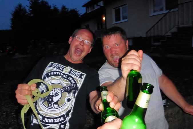 Bei der Staffelwechselstelle wird es ruhiger, die Letzten der Staffeln sind schon auf der Endrunde.Es wird dunkel. Fotos gelingen kaum noch, die Steaks auf dem Lidlwagen-Grill sind durch, die Jungs schwarz gekleidet mit Anti-Arbeit-Parole auf den Shirts, sind aber sonst nett, bieten mir Essen und Getränke an. Doch mein Magen macht Probleme. Es ist zu heiß und ich habe ausnahmsweise zu viel Wasser im Bauch.