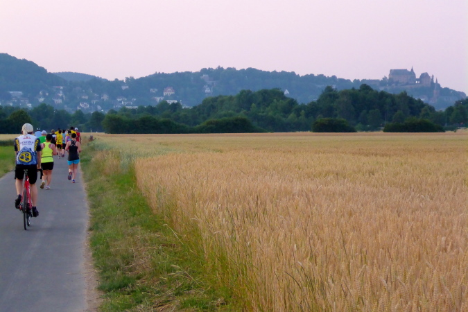 Unsere Laufstrecke führt nun direkt auf die Elisabethenkirche zu, die mit einem Kranz der untergehenden Sonne gekrönt wird. Finde ich gut. Es geht Richtung Wehrda. Mit „Werder“ bezeichnete man eine erhöhte Lage am Ufer. Aus dem Steinbruch hier stammen nicht nur die Sandsteine für die Elisabethenkirche, sondern auch für den Reichstag in Berlin. Die ersten Staffelläufer übergeben sich und ihre Startnummern.