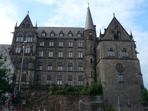 Die anderen rennen weiter durch die enge Gasse, kommen dann am Wilhelmsplatz zur halbseitig gesperrten Verkehrsstraße. Rechts sehen wir das Universitätsmuseum und die Stadthalle, dann kommt links die Elisabethkirche, die über dem Grabmal der heiligen Elisabeth von Thüringen errichtet wurde.