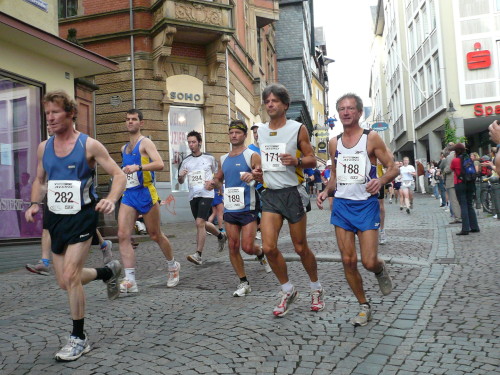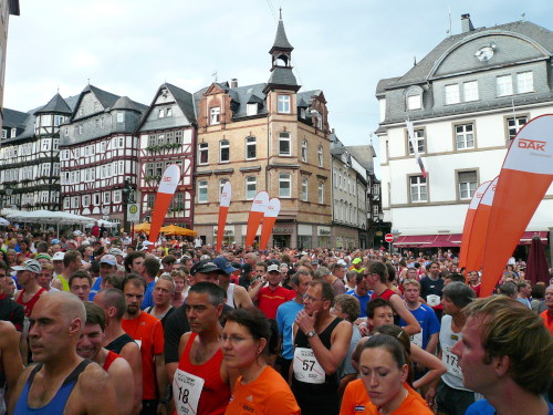 So viele Teilnehmer wie zuvor holen sich beim Jahnstadion ihre Startnummern ab: 232 Marathonis 15 Staffeln und 992 Halbmarathonläufer (alles Finisherzahlen), unter ihnen Dieter Baumann. Gestartet wird vor dem historischen Rathaus in der Oberstadt, 1000 Meter weiter und 100 Meter höher. „Die alte Stadt liegt krumm, schief und buckelig unter einer alten Burg“, beschrieben Besucher schon vor 200 Jahren die Stadt an der Lahn. Und der Märchenerzähler Jakob Grimm glaubte, es gäbe mehr Treppen auf der Straße als in den Häusern.
