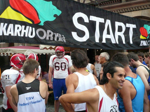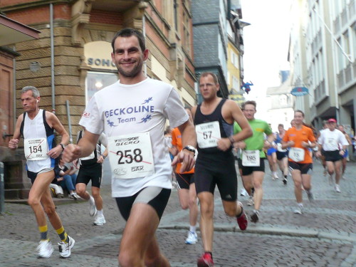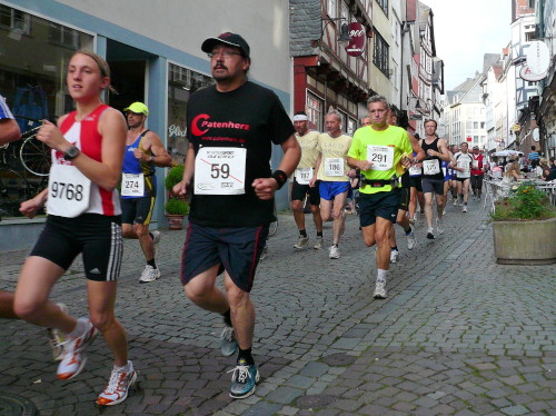 Hat man durch enge Gassen und über diese steilen Treppen den Aufstieg geschafft, offenbart sich einem die Altstadt mit dem Rathaus und den Fachwerkhäusern wie eine Mittelalterliche Filmkulisse. Statt Gaukler und anderes fahrende Volk bestimmen heute allerdings Läuferinnen und Läufer die Szene auf dem großen Platz. Das laute Stimmengewirr wird nicht wie sonst üblich von noch lauterer Musik übertönt, man kann sich gut unterhalten. Erst kurz vor dem Start wird demonstriert, dass man könnte, wenn man wollte: „Start me up“, die Rolling Stones geben das Vorspiel für den Startschuss.
