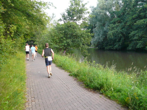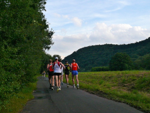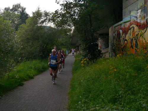 Ein Stück geht es jetzt direkt der Lahn entlang, dann erreichen wir den Stadtteil Wehrda, überqueren dort die Lahn und sind schließlich auf dem Lahntalradweg dem wir fortan in südlicher Richtung folgen. Zuvor haben uns schon die ersten Halbmarathonläufer überholt, unter ihnen auch Dieter Baumann, allerdings nicht als Erster. Diesen Platz belegt er erst im Ziel, und nur das zählt. Im Herbst, wenn er in Frankfurt den Marathon laufen will, wird ihm das mit Sicherheit nicht gelingen. Ich bin sicher, da melden sich jetzt etliche an, um dann später auf ihrer Urkunde zu vermerken, dass sie vor dem Olympiasieger in die Festhalle eingelaufen sind. Ist das vielleicht sogar gewollt?