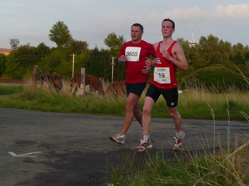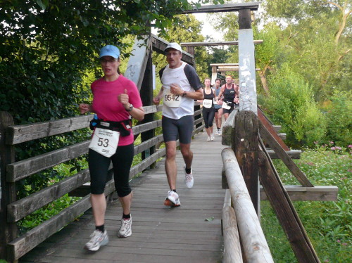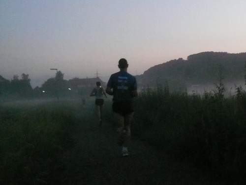 Über die schon bekannte Holzbrücke geht es hinaus in die Dämmerung. Es hat abgekühlt und ist jetzt richtig angenehm zu laufen. Nebel steigt von den Wiesen auf und verzaubert die Landschaft. Alles sieht anders aus und man hat überhaupt nicht das Gefühl, hier schon einmal gelaufen zu sein. Kaum ein Mensch ist zu sehen. Nur die Streckenposten halten ihre Stellung und feuern die Läufer an. Die Mädelriege macht weiter fleißig die LaOla-Welle.
