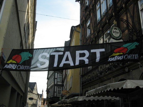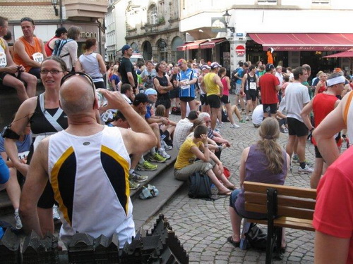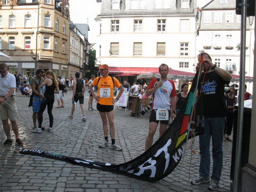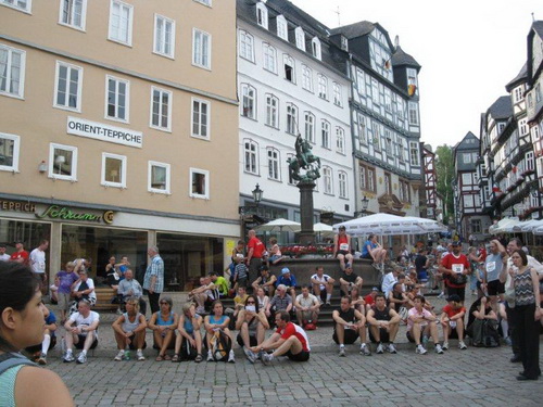 Langsam machen sich die Teilnehmer auf den Weg zum historischen Marktplatz, welcher einen schönen Rahmen für den Start abgibt. Der Weg dorthin führt steil bergauf, aber wir können ja langsam gehen und haben den Vorteil beim Start dann zur Lahn hinunterlaufen zu können.
