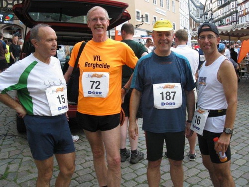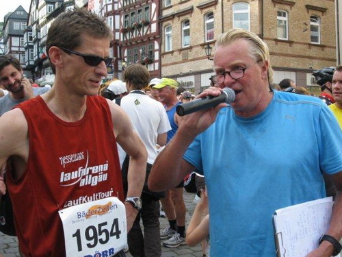 Im Starterfeld begrüße ich Wolfgang Bernath. Der m4y-Kollege war vor 3 Wochen noch in Biel dabei und erzählt begeistert von dem großen Erlebnis. Bald taucht auch Volker Berka mit seinem Laufkumpel Ernst Güdelhöfer auf. Volker ist an jedem Wochenende bei einer Laufveranstaltung dabei und unter der Marathondistanz tut er es nicht. Heiko Krause ist tatkräftig dabei das Startbanner zu montieren. Der USC Marburg ist ein kleiner Verein und alle Vereinsmitglieder müssen mithelfen, damit die Veranstaltung wieder ein Erfolg wird. Bei der heutigen 13ten Auflage kann man aber auch schon auf viel Routine setzten. Marco Diehl wird auch begrüßt. Er wird heute beim Halbmarathon mitlaufen.
