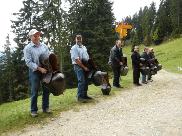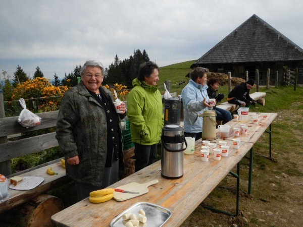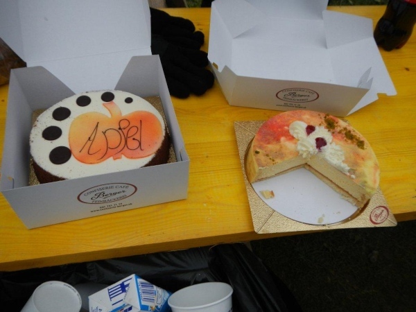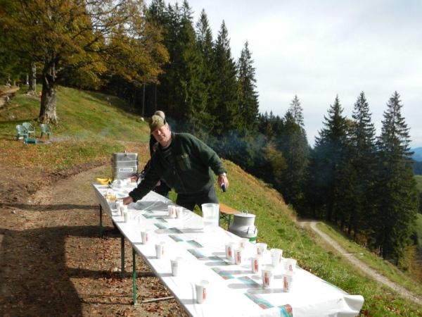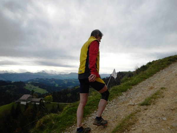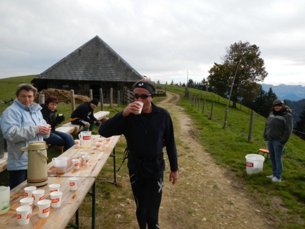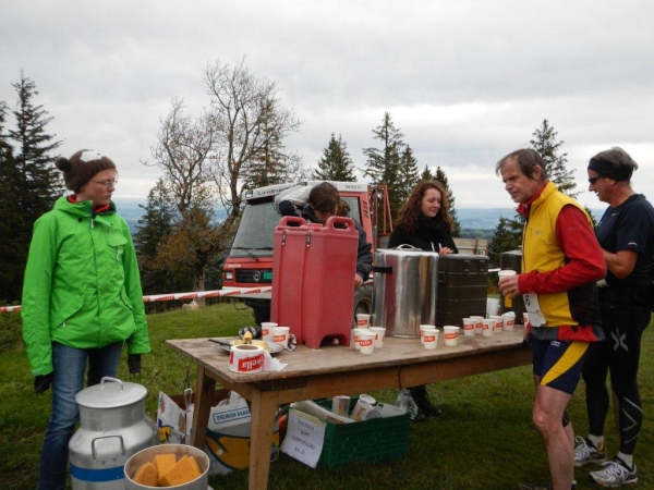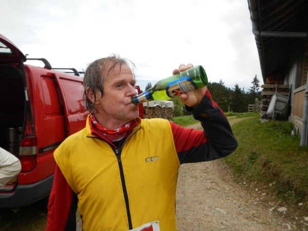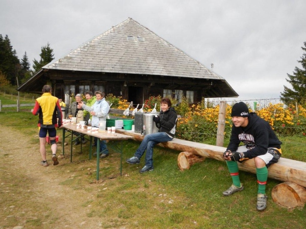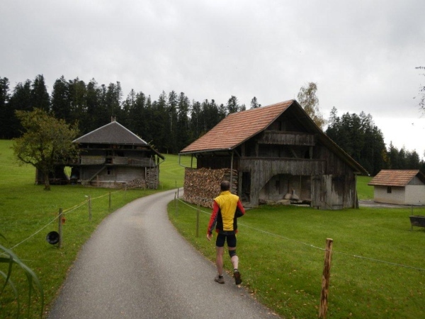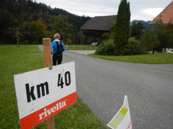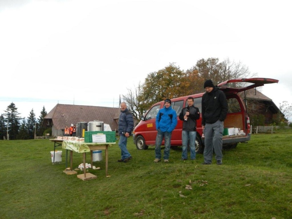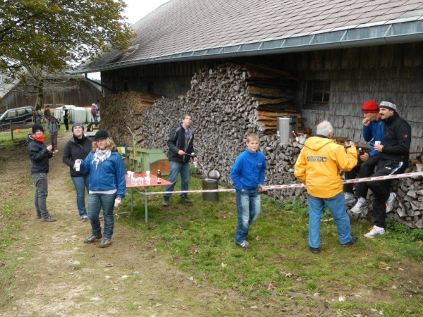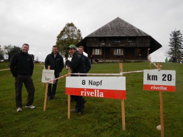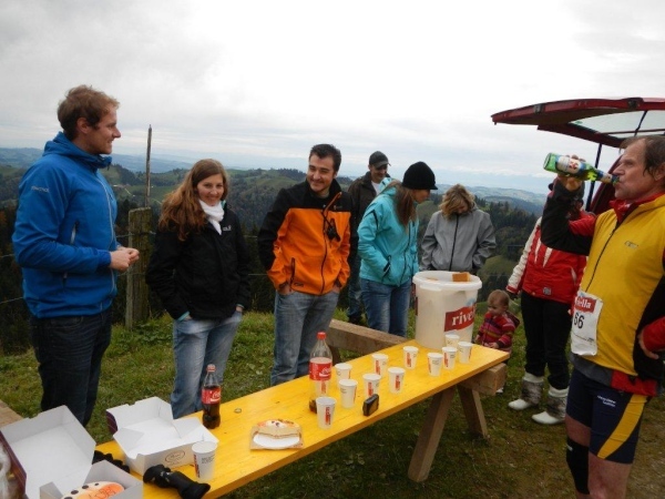 Beim zwölften Posten komme ich früher an als Wolfram, da er unterwegs noch einen Stein aus dem Schuh klauben muss. Ihr traditionelles Fondue haben die Helfer schon gegessen. Pech für mich, dass ich so spät dran bin. Bisher hätte ich mich immer dazusetzen können und wollte nicht. Jetzt würde ich gerne und kann nicht mehr. Aber die Gastfreundschaft ist die gleiche. Als Sohn einer Emmentalerin kann ich gewissermaßen von Halbblut zu Vollblut schon einfädeln, dass mein Mitstreiter zu einem Bier kommt, mir wird Torte angeboten.