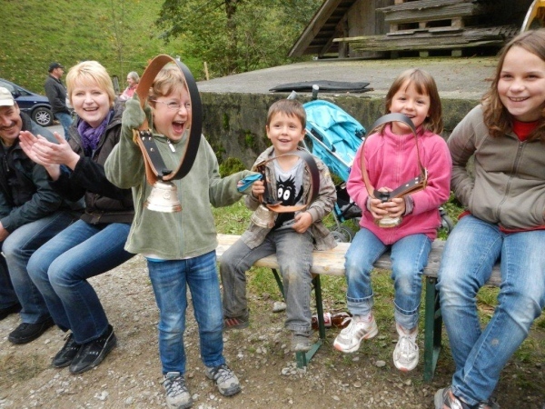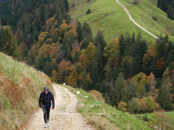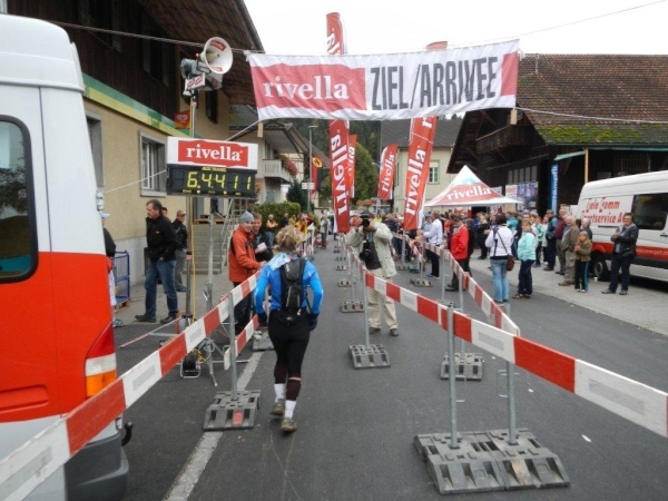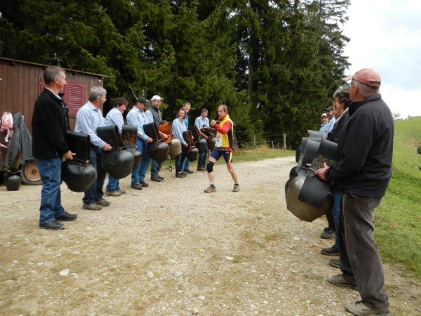 Es gibt noch einen längeren moderaten Gegenanstieg und im Gegenzug ein paar abschüssige Stellen, welche mit voller Gewalt auf meine müden Knochen wirken. Die Muskeln brennen, die Bänder stöhnen, die Sehnen dehnen sich bis kurz vor dem Knall und aus dem Hüftgelenk meine ich ein Knirschen zu vernehmen. Doch viele Tode kann ich nicht mehr sterben, denn nach dem sechzehnten(!) und letzten Verpflegungsposten geht es nur noch einen guten Kilometer bis zum Ziel. Zudem schwingen die Kinder voller Inbrunst ihre Glocken und Treicheln als wären wir die Führenden des Feldes. Nein, so tönen keine Totenglocken!