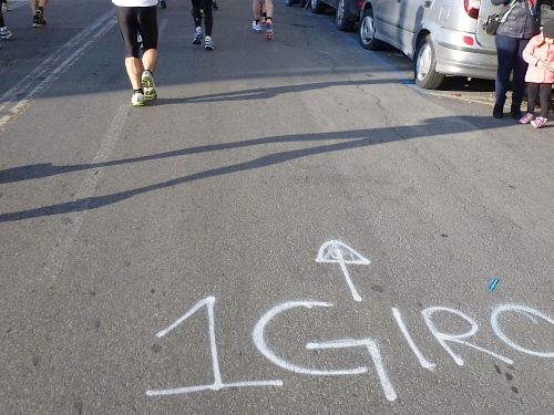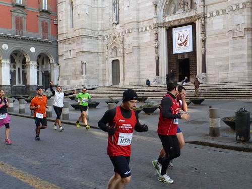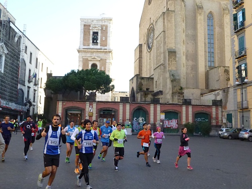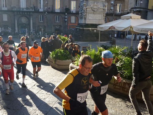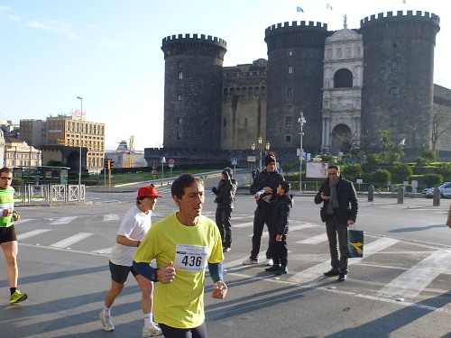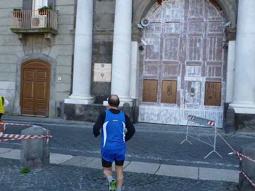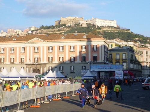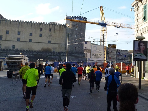 Wir laufen in einige Straßen, die ausreichend breit sind, sodass kein Gedränge entsteht. Auffallend ist schon jetzt, dass es recht hügelig zugehen wird. Ich grüße einen Läufer des 100-Marathon-Clubs mit seinem Namen: „Roger“ steht auf seinem Hemd; er hat die Nummer 300. Zu Hause stelle ich fest, dass es sich um den Vorsitzenden des 100-MC Großbritannien handelt. Er ist schon über 700 Marathons gelaufen. Auffallend gute Stimmung bei den Läuferinnen und Läufern. Es wird viel gescherzt. Nach wenigen Kilometern kommen wir schon an einem Highlight vorbei, dem Castell Nuovo aus dem Jahre 1271, jetzt Rathaus mit bemerkenswertem Portal. Kurze Zeit später ein Hinweis auf die erste Runde.