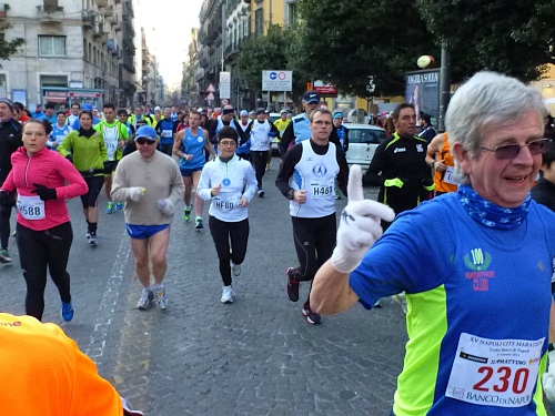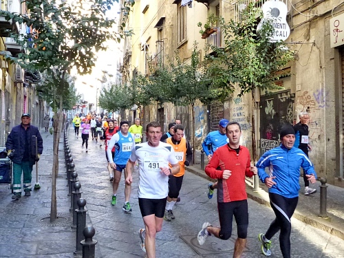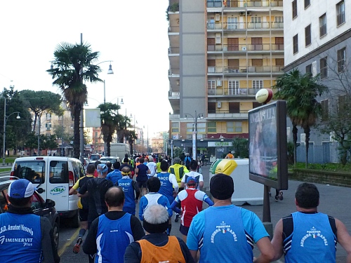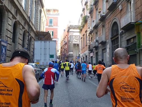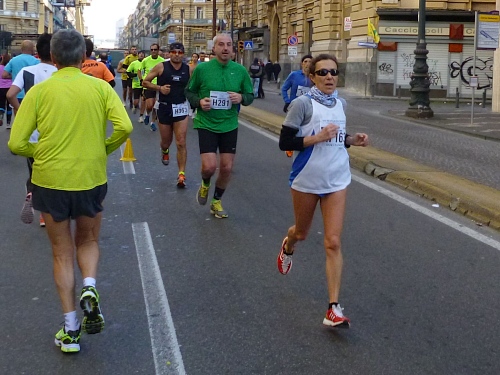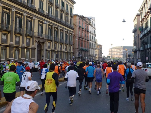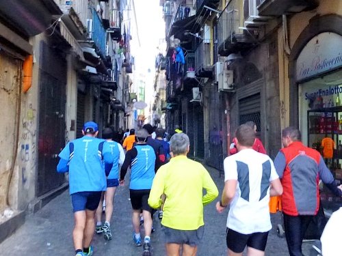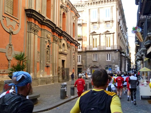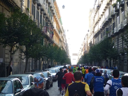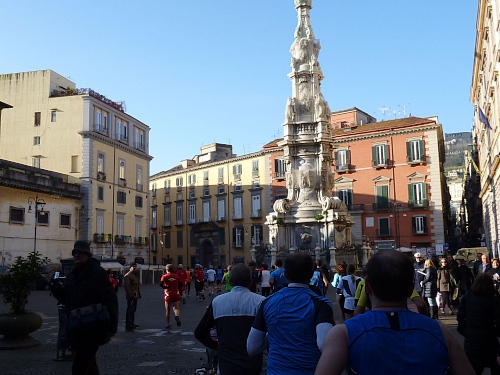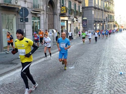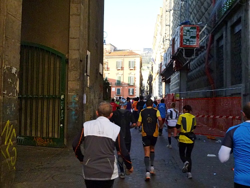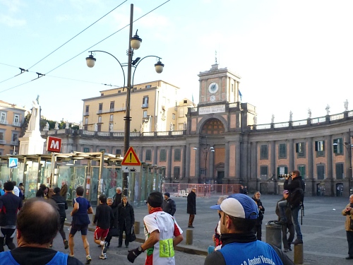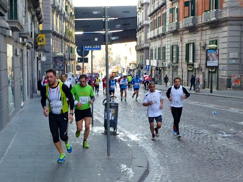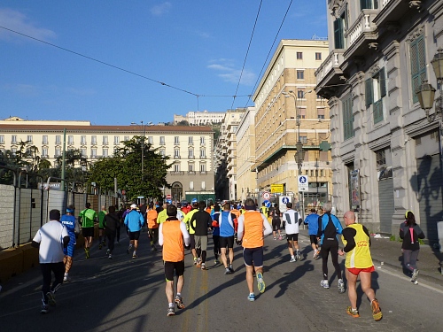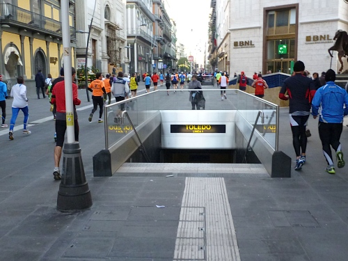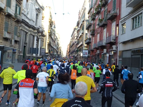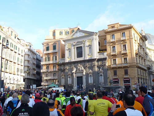 Um 7:30 Uhr am Sonntag fahren wir mit dem Bus zum Start bei der Marathonmesse. Irgendwann nach 8:30 Uhr fällt dann der Startschuss. Ca. 2.000 Teilnehmer aller Bewerbe haben sich ohne Blockeinteilung aufgestellt. Alle sind gut gelaunt. Gleich geht es in die Einkaufsstraße Via Toledo. Natürlich sind um diese Zeit die Geschäfte noch geschlossen. Viele bleiben es aber den ganzen Tag über - eher untypisch für Italien.