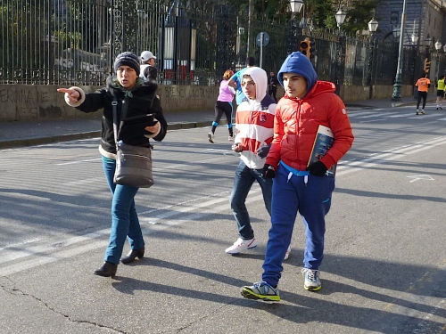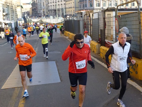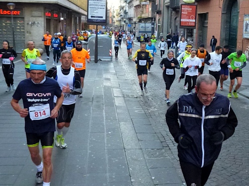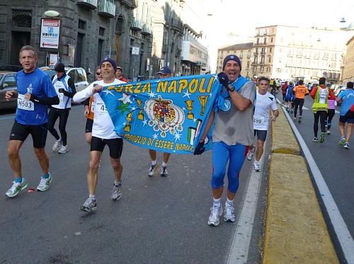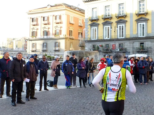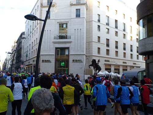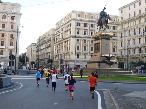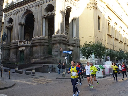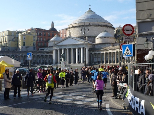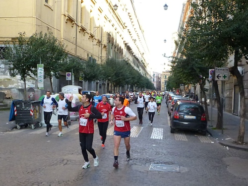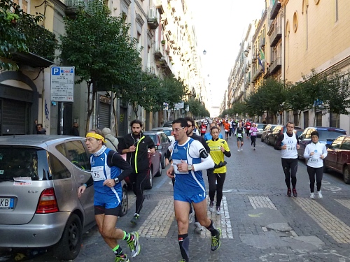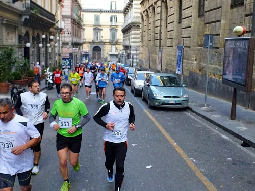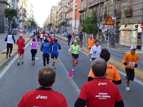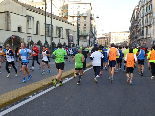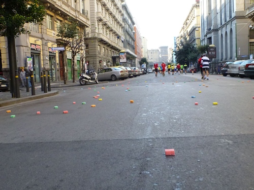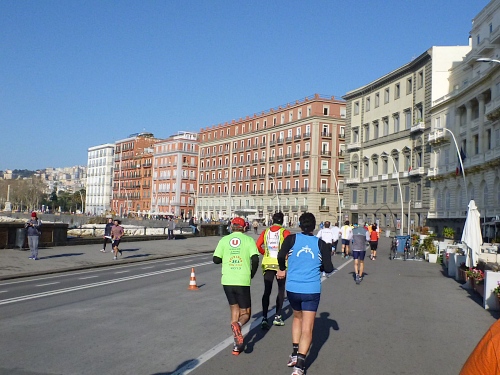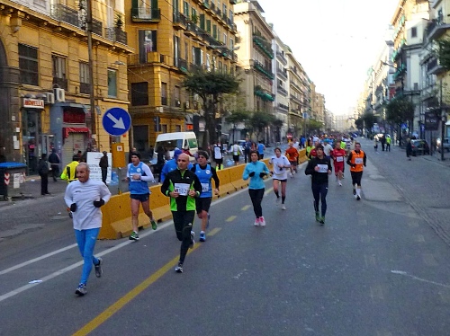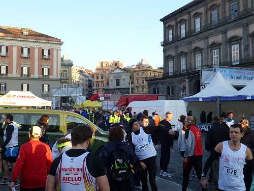 Um 7:30 Uhr am Sonntag fahren wir mit dem Bus zum Start bei der Marathonmesse. Irgendwann nach 8:30 Uhr fällt dann der Startschuss. Ca. 2.000 Teilnehmer aller Bewerbe haben sich ohne Blockeinteilung aufgestellt. Alle sind gut gelaunt. Gleich geht es in die Einkaufsstraße Via Toledo. Natürlich sind um diese Zeit die Geschäfte noch geschlossen. Viele bleiben es aber den ganzen Tag über - eher untypisch für Italien.