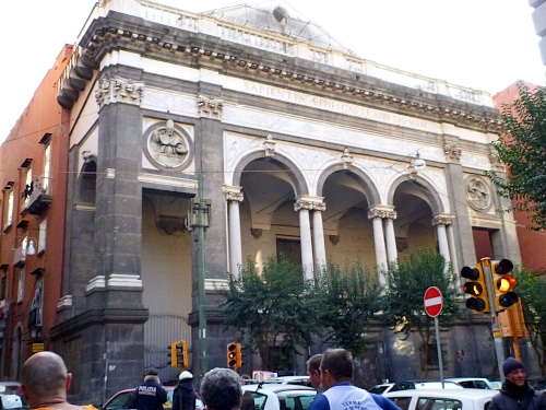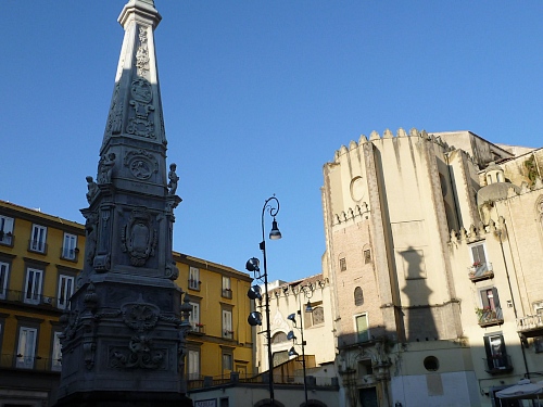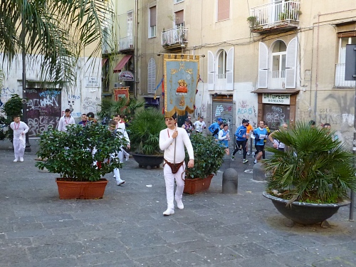 Vor uns auf einmal eine kleine Prozession mit Fahne – heute ist ja Sonntag und der Neapolitaner ist sehr religiös. Auf einer längeren geraden Straße kommen wir am Dom vorbei. Wenigstens den unteren Teil des Bauwerks kann ich fotografieren. In ihm befindet sich die Grabstätte des Stadtheiligen San Gennaro. Darunter sein Kopf in einer Goldbüste und sein Blut, das sich auf wundersame Weise und unter größter Anteilnahme der Bevölkerung jedes Jahr mehrmals verflüssigt, wenn es in die Nähe des Hauptes des Heiligen gebracht wird.