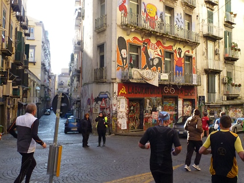 ehen haben. Jetzt geht’s ins Centro Storico (historisches Zentrum), Weltkulturerbe seit 1995. Hier befinden sich große, leider oft auch ziemlich verkommene Häuser an engen Gässchen. In einem Fernsehbericht hieß es einmal, dass hier noch viele Geschäftsbesitzer in ihren kleinen Läden wohnen. Sehr interessante Umgebung, soweit man das während des Laufens wahrnimmt. Den Untergrund bilden große Platten aus schwarzem Vulkangestein (Pipernum), von denen manche gefährlich herausstehen. Über uns hängt Wäsche aus dem Fenster. Bin happy. Ich schieße viele Fotos, die leider wegen der Dunkelheit in den Gassen oft verwackelt sind.