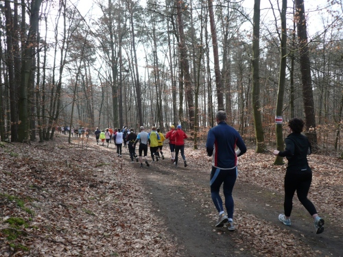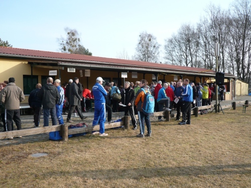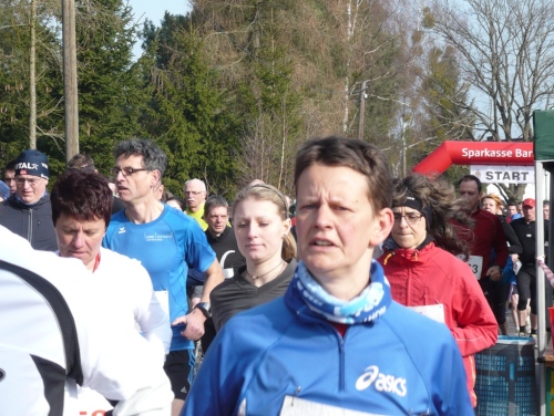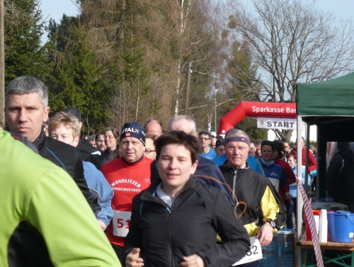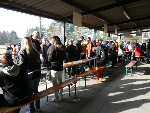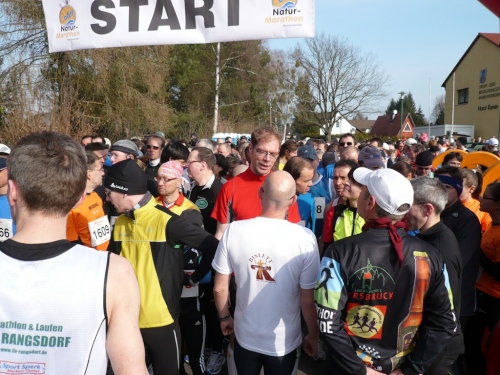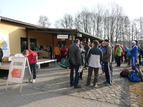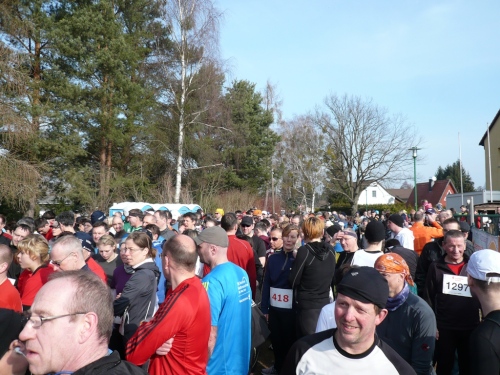 So gegen 9 Uhr ist schon richtig viel los. Parkplätze gibt es an einem naheliegenden See auf einer Wiese. Der See ist heute Morgen noch zum Teil zugefroren. An den Meldeschaltern stehen die Läufer in Schlangen an, um ihre Startnummer zu holen. Alles läuft reibungslos dank einer guten Organisation. Frank Göritz nimmt immer wieder das Mikrofon in die Hand, um die Läufer über Startzeiten, Umkleiden und alles wichtige zu informieren. Es strahlt eine große Ruhe aus, auch als ihn Läufer mit Fragen unterbrechen.