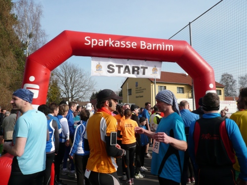 Um 10 Uhr kommt der erlösende Schuss und das Feld setzt sich in Bewegung. Es geht durch die „großen Ohren“ der Bip-Chip Zeitnahme. Wir laufen die Biesentaler Straße in südliche Richtung, weg vom Finowkanal. Den können wir rückwärtig jedoch nicht sehen, denn dazwischen liegt ein leichter Knick.