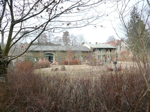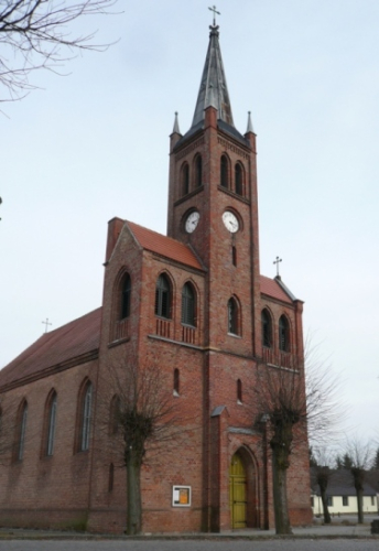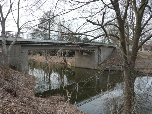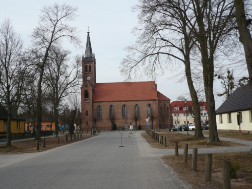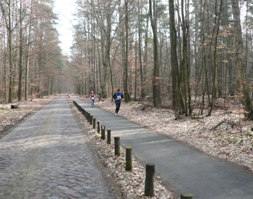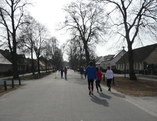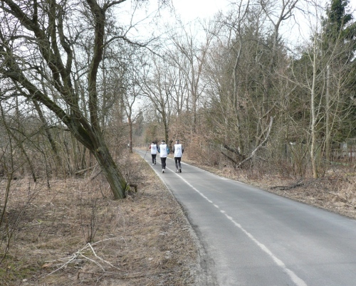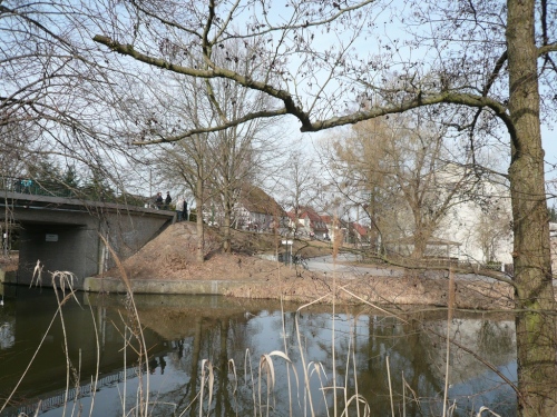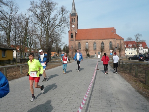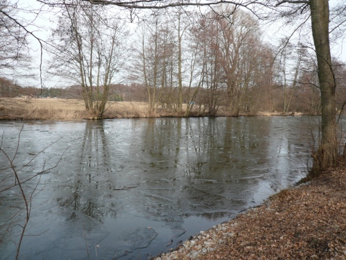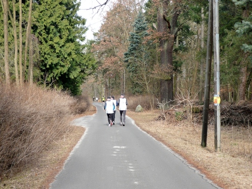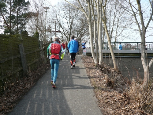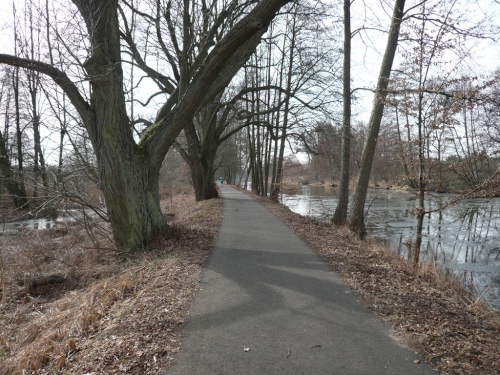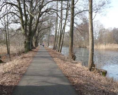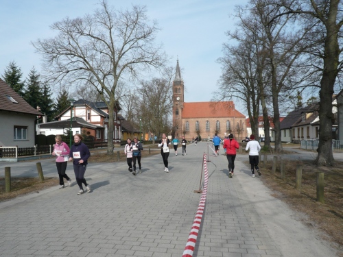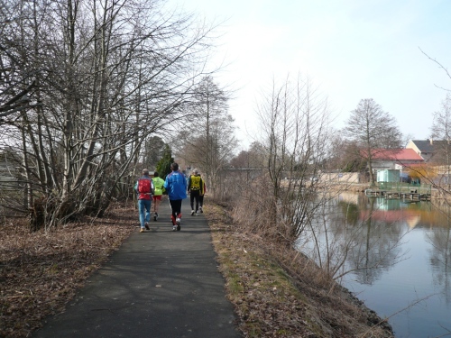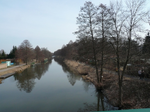Der Kanal ist noch zum Teil zugefroren. Ein Stück weiter sind auf der anderen Kanalseite Cafés und Bootsverleihe, die heute jedoch noch nichts zu tun haben. Kurz vor der Brücke an der Biesentaler Straße, die über den Kanal führt, geht es kurz und heftig zur Brücke hoch. Über die Brücke rechts ab zur Marienwerder Kirche. Hier befindet sich eine Wendepunktstrecke von ca. 1km Länge. Ein Blick zur neugotischen Kirche und dann auf direktem Weg zurück über den Kanal zum Ziel. Kurz hinter der Brücke ist die 1. Runde beendet.