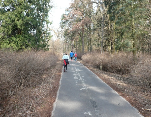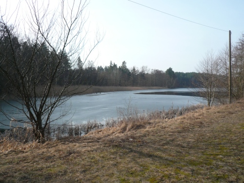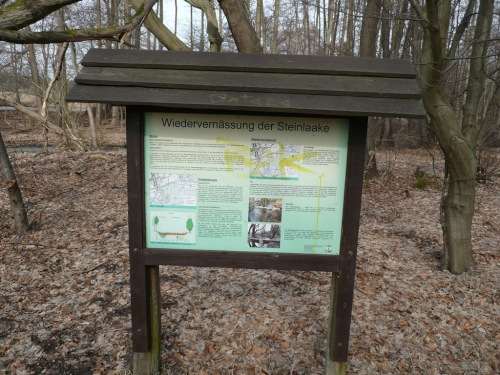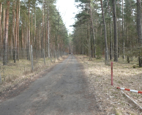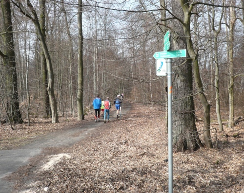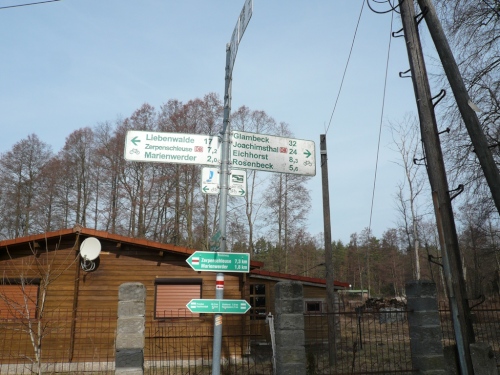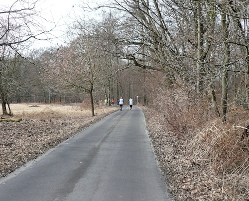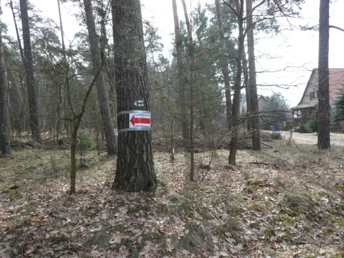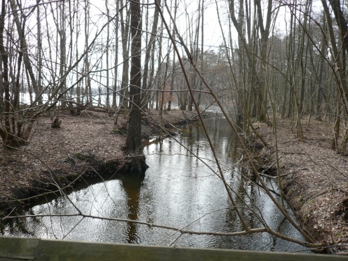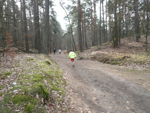 Es geht ca. 400 Meter am See entlang über sandigen Boden der einige Wellen hat. Nach ca. 2 km kommen wir an eine Weggabelung, in deren Mitte der Eiserbuder See beginnt, der im Hintergrund auch zu sehen ist. An der Gabelung nach rechts kämen wir in den 3. Ortsteil Sophienstädt. Wir biegen jedoch an der Gabelung links ab, denn unsere Laufstrecke verläuft parallel zum See weiter in süd-östl. Richtung. Ganz in Seenähe laufen wir über ein Brückchen und weiter durch den zu dieser Jahreszeit noch sehr durchsichtigen Wald. Wir sehen den See rechts neben uns liegen.