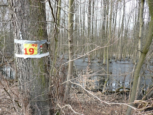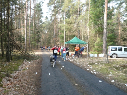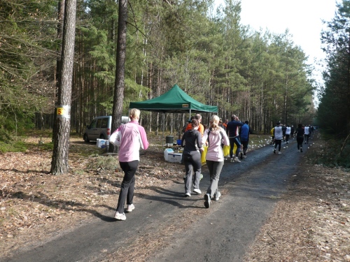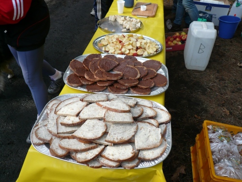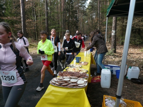 Nach wenigen Hundert Metern am See biegen wir in östliche Richtung ab und kommen bis kurz vor die Spitze vom Bukowsee. Hier geht es in spitzen Winkel nach Norden direkt neben dem Forsthaus. Nach ca. 1km geht es dann weiter in nordöstliche Richtung. Bei km 5 befindet sich die 2. Verpflegungsstelle. Die 1. ist direkt hinter dem Start/Ziel Banner. Hier mitten im Wald gibt es ein großes Buffet mit Wasser, warmen Tee, Haferschleim, Schmalz- und Nutellabroten, Äpfel und Bananen.