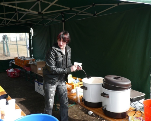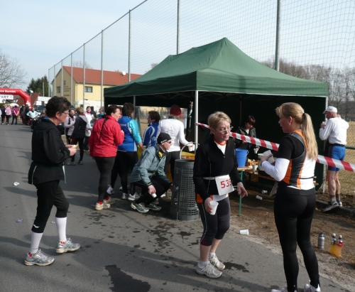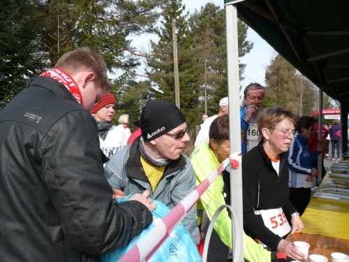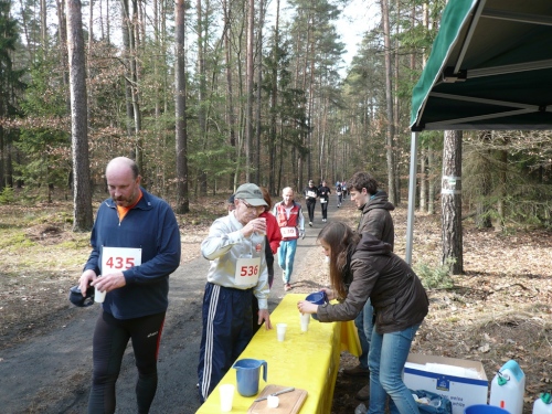 Jetzt geht es in die 2. Runde. Die ¼ Marathonis sind fertig. Kurz hinter dem Zielbogen befindet sich die Verpflegungsstelle die identisch ist mit der Verpflegung im Wald. Jetzt noch etwas warmen Tee trinken und weiter geht es.