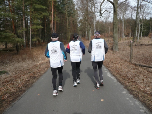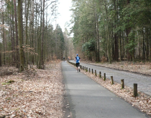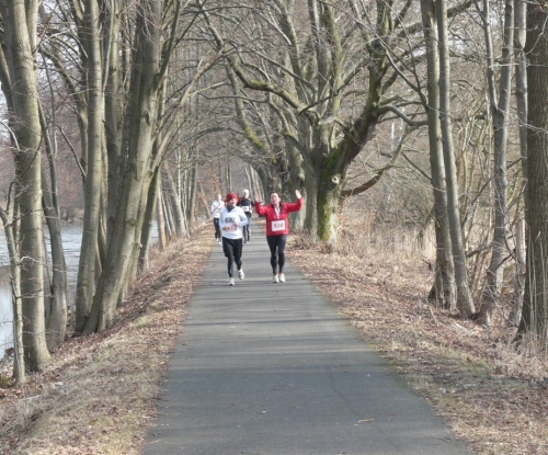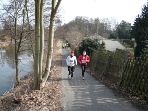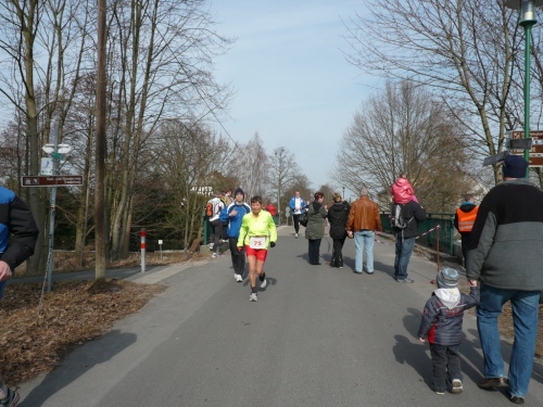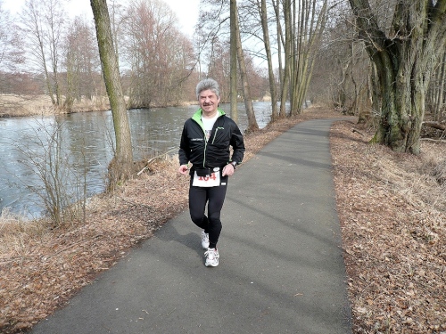 Wer jetzt noch in die 3. Runde läuft, ist bestimmt ein Läufer, der für die anstehenden Frühjahrsmarathons aufbaut, denn es bietet sich idealerweise an, 31,5km zur Marathonvorbereitung zu laufen. Es wird noch leerer auf der Strecke man sieht kaum einen Läufer vor oder hinter sich. Jetzt sind auf der 10,5km Schleife nur noch 192 Teilnehmer unterwegs. Mein rechter Fuß beginnt zu schmerzen. Auf dem Asphalt habe ich Stiche im Fußgelenk. Der Wirt an der Grafenbrücker Schleuse steht immer noch da und klatscht. Kurz vor Ende meiner 3. Runde läuft Tobias Barthl Start zu mir auf. Er muss ein wenig verschnaufen, wir fotografieren uns gegenseitig. Er läuft nach 3:47:03 durchs Ziel.