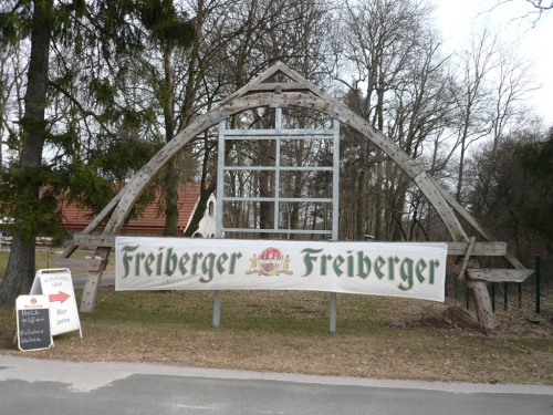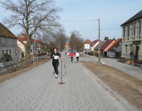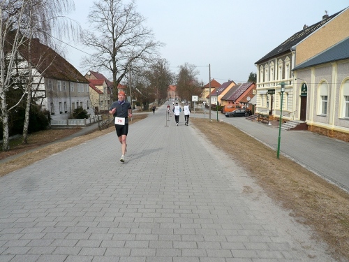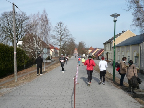 Kurz danach laufe ich auf drei Läufer der „Lokvögel Angermünde“ auf. Ich klemme mich bis zum Ende der 2. Runde an sie und werde so ein wenig abgelenkt. Wir kommen wieder am Künstlerhof vorbei. Diesmal entdecke ich das große Schild „Männerplatz“, kann jedoch nicht erkennen wofür. Weiter geht es. Am Ende der 2. Runde, was auch gleichzeitig Halbmarathon ist, beenden die „Lokvögel“ ihren Lauf sowie auch weitere 188 Teilnehmer.