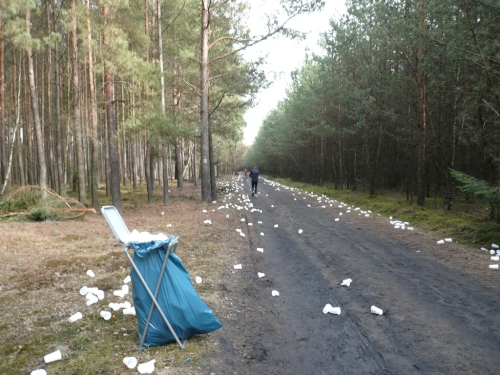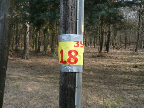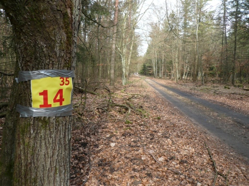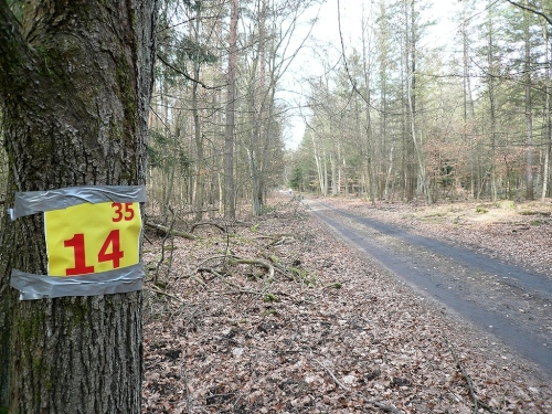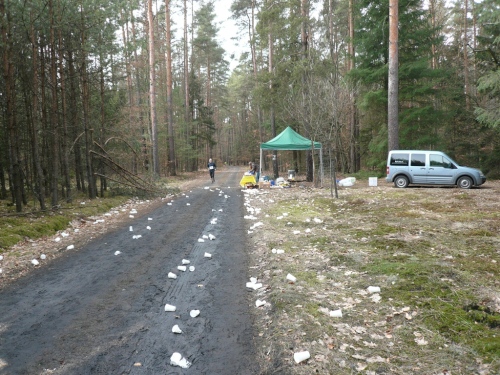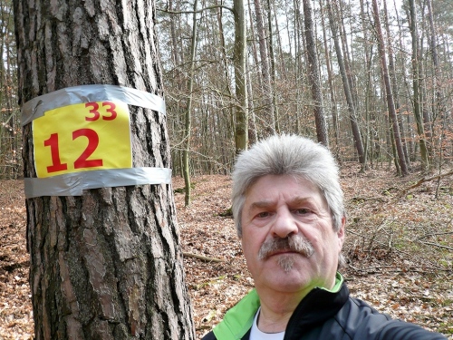 Die Laufstrecke ist bestens ausgeschildert durch große rote Richtungspfeile und noch zusätzlich an jedem Knick mit Pfeilen aus Sägespänen auf dem Boden. Ein Verlaufen ist hier unmöglich. An der Verpflegungsstelle im Wald, die von zwei jungen Helfern betreut wird, läuft alles prima.