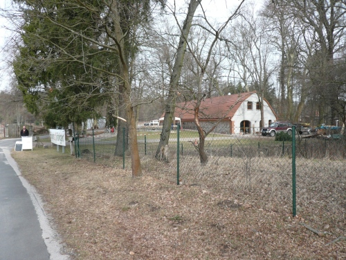 Kurz danach geht es über ein Brückchen, neben uns auf der Weide vergnügen sich drei Ponys. Wir laufen jetzt direkt auf die Grafenbrücker Schleuse zu. Herrlichster Sonnenschein begleitet uns. Links unserer Laufstrecke erstreckt sich große Lichtung. Direkt vor der Schleuse biegen wir links ab, in Richtung Marienwerder. Der Wirt steht hier und beklatscht die Läufer. Im Hintergrund ist an der Schleuse ein großer Lastkahn zu sehen. Wir kommen an einem verfallenen Haus vorbei, das wahrscheinlich einmal das Forsthaus Grafenbrück war. Kurz vor Km 9 wechseln wir auf einen Waldweg, der uns direkt an den Finowkanal bringt.