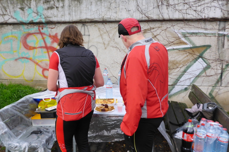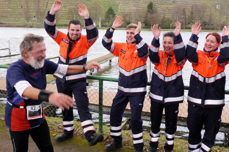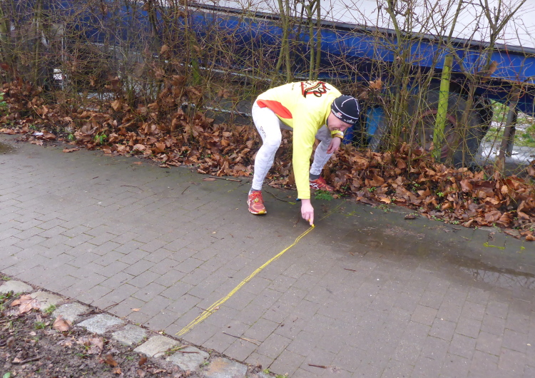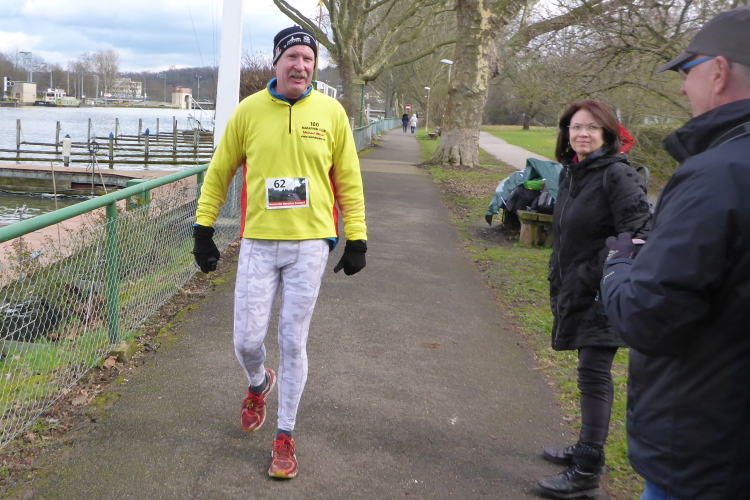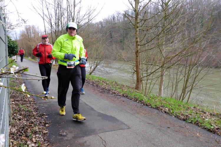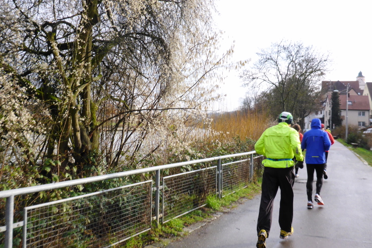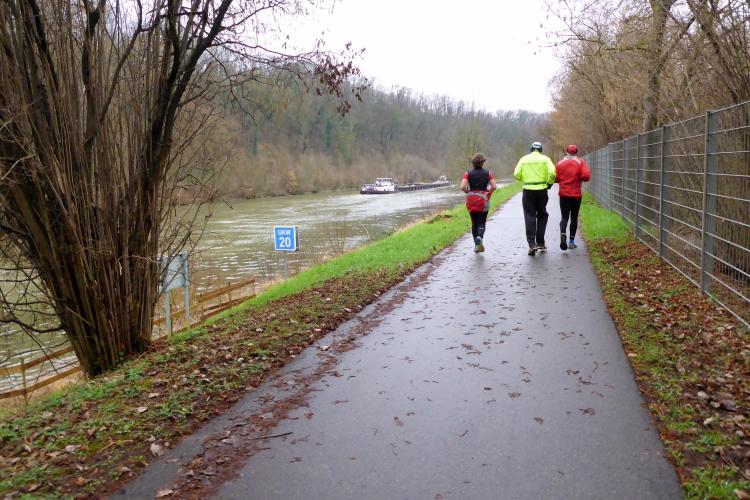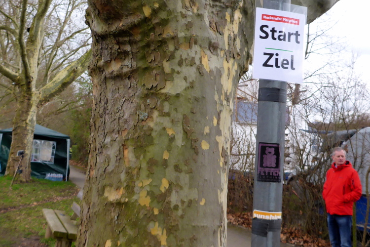 Kaum sind wir zurück, geht es auch schon los. Michael macht noch eine kurze Einführung. Beim letzten Mal hatten einige Läufer Markierungen übersehen und sind falsch gelaufen. Daher wurden zusätzliche Schilder angebracht. Leider hat es letzte Nacht geregnet und so besteht die Gefahr, dass die Markierungen auf dem Boden gelitten haben. Eigentlich ist es aber ganz einfach: immer am Neckar entlang, dann über die Schleuse bei Aldingen, auf der anderen Seite zurück, über den Drei- Burgen-Steg und dann an Start/Ziel vorbei in die entgegengesetzte Richtung. Hier muss man dann tatsächlich einmal aufpassen, denn es gibt einen Abzweig auf eine Schleife um ein kleines Ausflugslokal herum, dann über den nächsten Steg zurück auf die andere Neckarseite; dort bis Bad Cannstatt, über die große Brücke und wieder zurück. Das ganze zweimal, wobei man sich beim zweiten Mal die Schleife um das Lokal sparen darf.