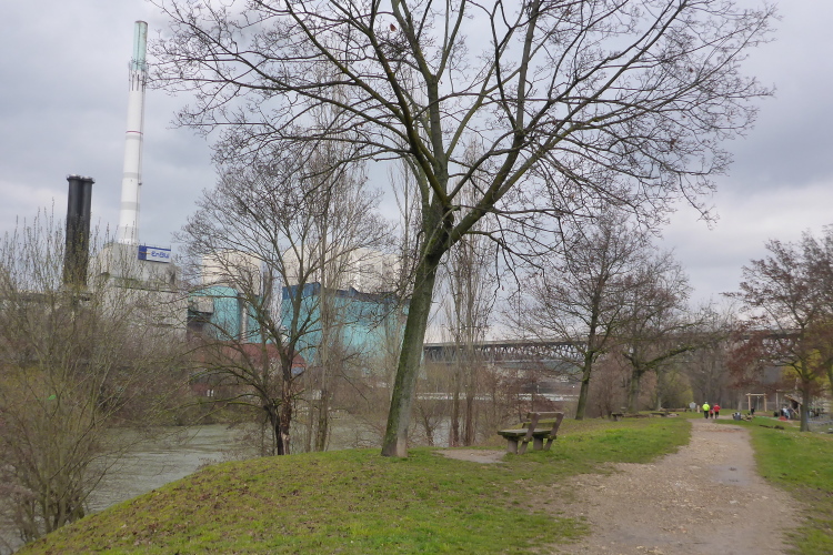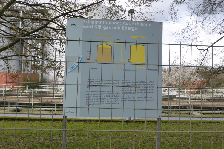 Nachdem wir uns mit Kuchen, Muffins, Salzstangen, Kräckern und Getränken gestärkt haben, geht es bergab. Wir verlassen die Brücke und laufen auf der anderen Seite des Neckars auf dem Radweg wieder zurück. Das Aldinger Industriegebiet ist mit einem massiven Stahlzaun vom Radweg getrennt. Jetzt kommen wir direkt am großen Mühlhausener Hauptklärwerk vorbei. Alles macht einen gepflegten und sauberen Eindruck. Man riecht nichts. Bis zum Vier-Burgen-Steg ist es nicht mehr weit. Diesmal geht es über den Steg, und damit sind wir wieder auf der Strecke, die wir am Anfang entgegengesetzt gelaufen sind.