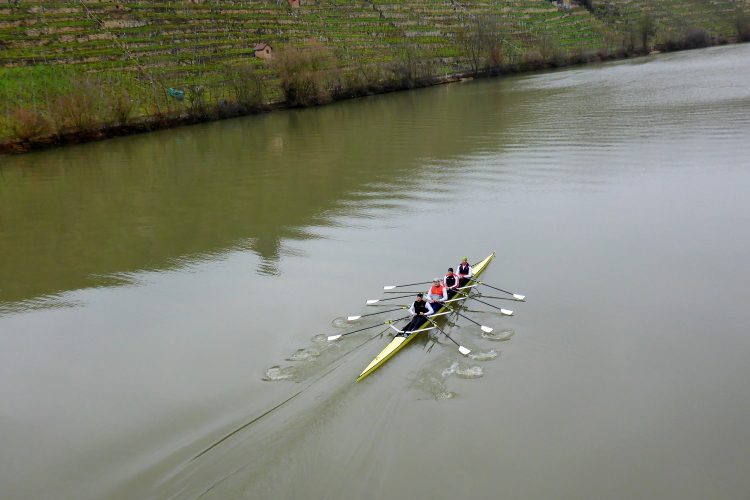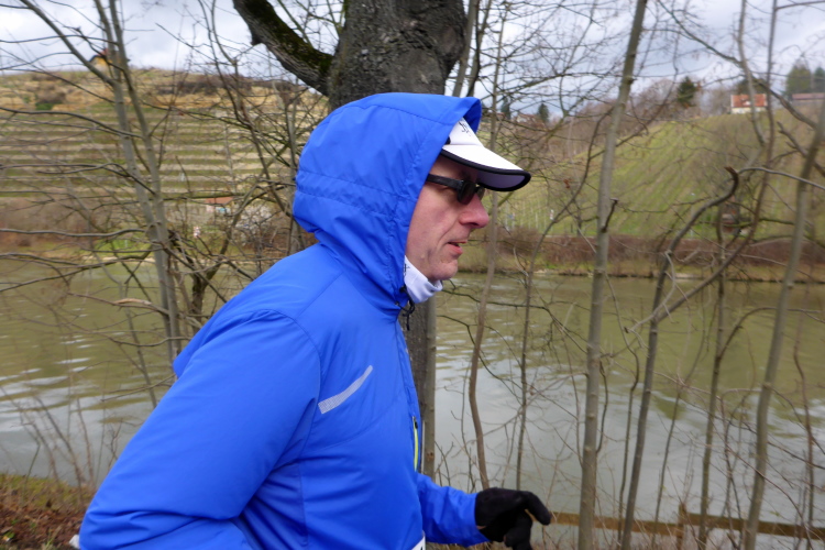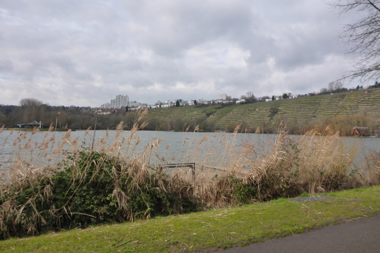 Auf den Sportanlagen des SPVGG Cannstatt wird gekickt. Einmal rechts und gleich wieder links – so erreichen wir die Hofener Straße in Richtung Stuttgart Hofen. Ca. 2km bleiben wir auf dem Gehweg. Die Straße ist recht stark befahren. Trotzdem begegnen uns hier, vor allem in der 2. Runde, erstaunlich viele Jogger. Wenn man sich die Autos wegdenkt, läuft man flach zwischen Weinbergen und Wasser. Mir gefällt das ganz gut. Jetzt kommt sogar ein wenig die Sonne heraus. Als die Straße eine Rechtskurve macht, bleiben wir am Fluss. Hier ist die Zufahrt zum Cannstatter Ruderclub und zur Anlage von „City Golf“, einem Mekka für Golfer.