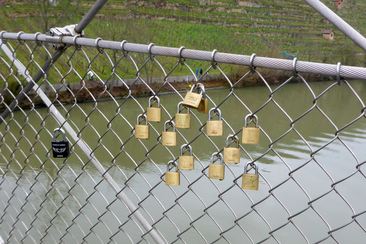 Im Volksmund wird die 1989 eingeweihte Hängebrücke gerne „Golden Gatele“ genannt. Dort müssen wir nun erst mal hinauf. Für mich ist das ein Berg und wird somit Gehschritt angegangen. Schön ruhig ist es hier, einsam zieht ein Ruderboot seine Bahn. Ich habe Zeit, die vielen Liebesschlösser anzusehen, die das Brückengeländer schmücken, dann geht es schon wieder hinab. Am Ende der Brücke führt ein schmaler Pfad bis ans Wasser hinunter. Auf der Austraße ist einiges los. Hier liegt die Zaißerei, ein Weingut mit Restaurant, das in seiner Kelter Platz für bis zu 150 Personen bietet. Scheinbar kommen gerade alle Gäste auf einmal und versuchen jetzt einen Parkplatz direkt vor dem Tor zu finden.